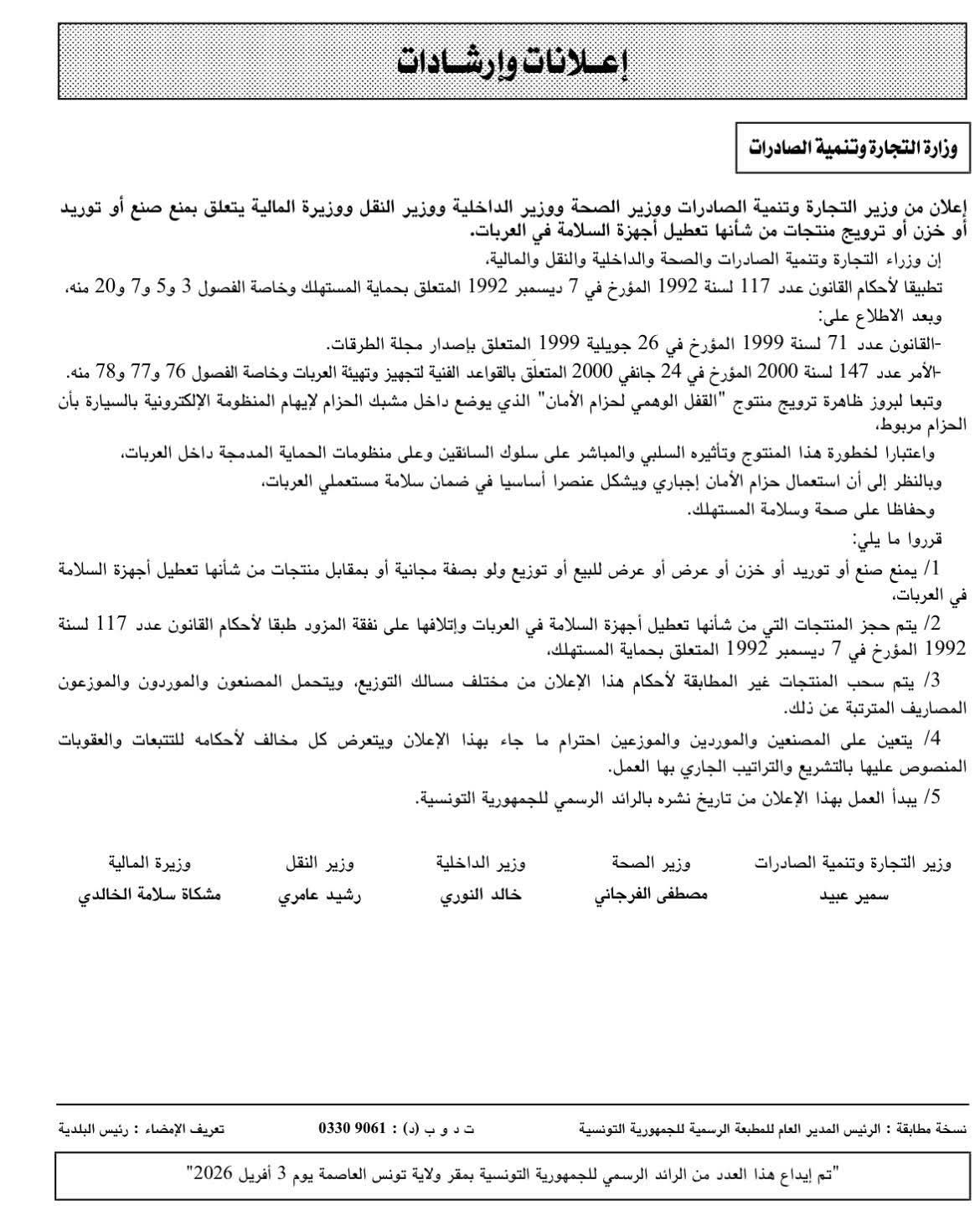 أصدرت خمس وزارات تونسية بلاغاً مشتركاً يقضي بـ المنع البات لصناعة، توريد، خزن، أو ترويج المنتجات التي تعطل أجهزة السلامة في العربات، مع التركيز بشكل خاص على "القفل الوهمي" لحزام ...
